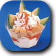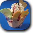 (nur in der Saison) Gemischtes Fruchteis, Melonenscheiben, Erdbeeren, Kiwischeiben, Soße, Sahne